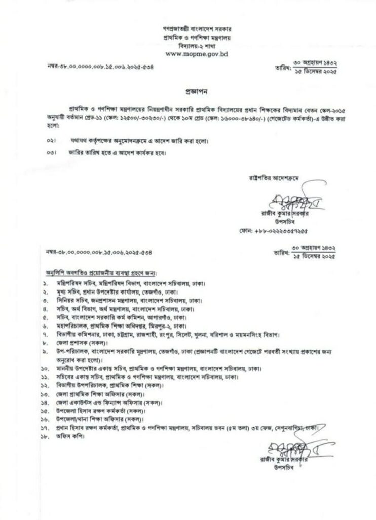 ১৫ ডিসেম্বর ২০২৫ তারিখে জারি করা এই আদেশের মাধ্যমে প্রধান শিক্ষকদের বেতন বৈষম্য দূরীকরণ ও পেশাগত মর্যাদা বৃদ্ধির নতুন ধাপ উন্মোচিত হলো।