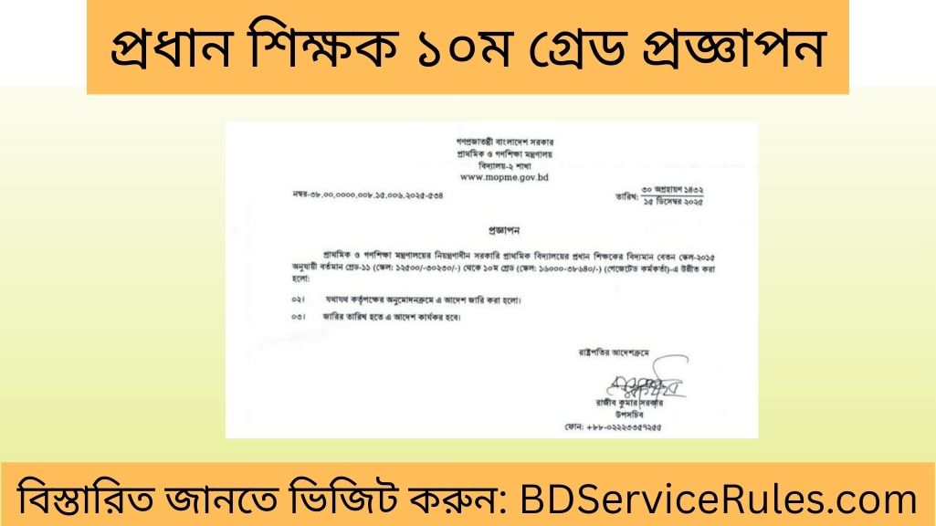 সরকারি প্রাথমিক বিদ্যালয়ের প্রধান শিক্ষকদের জন্য সুখবর! দীর্ঘ প্রতীক্ষার পর প্রাথমিক ও গণশিক্ষা মন্ত্রণালয় প্রধান শিক্ষকদের পদমর্যাদা ১১তম গ্রেড থেকে ১০ম গ্রেডে উন্নীত করে প্রজ্ঞাপন জারি করেছে। এর ফলে এখন থেকে প্রধান শিক্ষকরা ‘১০ম গ্রেড’ ভুক্ত গেজেটেড কর্মকর্তা হিসেবে গণ্য হবেন।