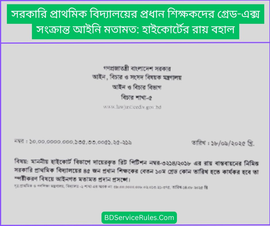 বাংলাদেশের আইন, বিচার ও সংসদ বিষয়ক মন্ত্রণালয় সম্প্রতি এক গুরুত্বপূর্ণ আইনি মতামত প্রকাশ করেছে, যা সরকারি প্রাথমিক বিদ্যালয়ের শিক্ষকদের দীর্ঘদিনের একটি দাবিকে সমর্থন করে। এই মতামতটি হাইকোর্টের একটি রিট পিটিশনের (নং ০২২৪/২০১৮) রায়ের সাথে সম্পর্কিত, যেখানে ৮২ জন প্রধান শিক্ষকের গ্রেড-এক্স-এর সুবিধা পাওয়ার অধিকার নিশ্চিত করা হয়েছিল।