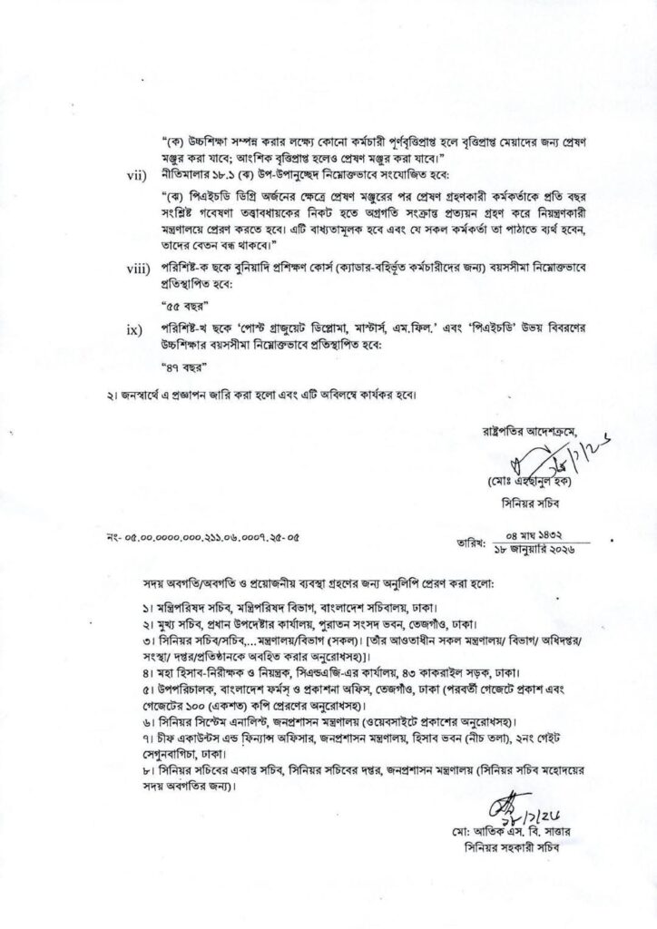 জনপ্রশাসন মন্ত্রণালয়ের এই সংশোধনী (১৮ জানুয়ারি ২০২৬) মূলত সিভিল সার্ভিসে গতিশীলতা আনা এবং উচ্চশিক্ষার নামে দীর্ঘসূত্রিতা কমানোর একটি প্রয়াস। বিশেষ করে পিএইচডি গবেষণার নামে বছরের পর বছর প্রেষণে থেকে কাজের অগ্রগতি না দেখানোর দিন শেষ হতে চলেছে। আপনি যদি সরকারি চাকরিজীবী হন, তবে এখনই নিজের প্রশিক্ষণ ও উচ্চশিক্ষার পরিকল্পনা এই নতুন বয়সসীমা অনুযায়ী সাজিয়ে নিন।