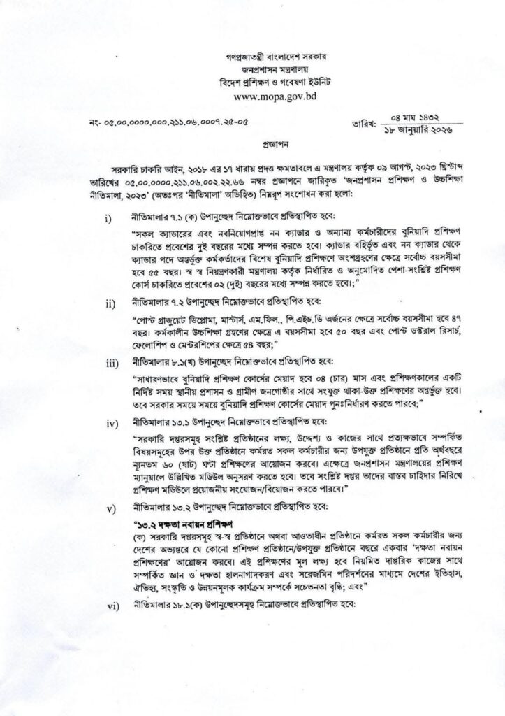 - প্রশিক্ষণের সময়সীমা: সকল ক্যাডার এবং নবনিয়োগপ্রাপ্ত নন-ক্যাডার কর্মচারীদের চাকরিতে যোগদানের প্রথম ০২ (দুই) বছরের মধ্যে আবশ্যিকভাবে বুনিয়াদি প্রশিক্ষণ সম্পন্ন করতে হবে।